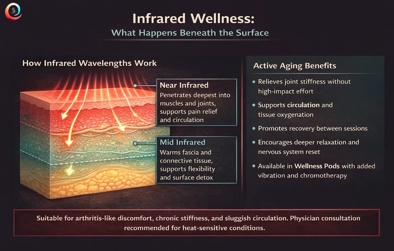 Unlike conventional heat sources that warm only the air around you, infrared light penetrates the skin and warms tissue from the inside out. This triggers vasodilation, increases blood flow to muscles and joints, supports tissue oxygenation, and activates the body’s natural recovery processes without placing additional strain on the cardiovascular system. Our Wellness Pods combine far-infrared heat with dry convection, vibration massage, chromotherapy, and aromatherapy for a fully immersive, restorative session.
