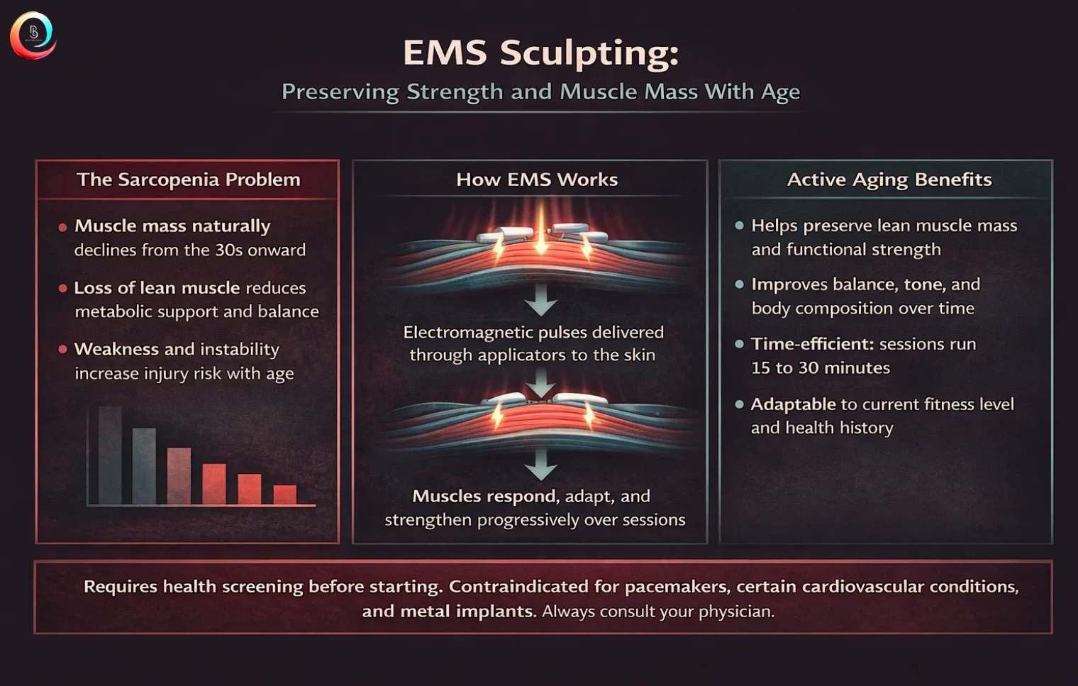 Why it matters: Muscle mass naturally declines with age through a process known as sarcopenia. Research shows that maintaining skeletal muscle mass is strongly linked to better metabolic health, lower all-cause mortality risk, improved insulin sensitivity, and greater physical independence in older adults. EMS stimulates muscles in a way that complements or supplements voluntary movement, making it a relevant option for clients who want to preserve strength and tone without high-impact or high-intensity exercise.