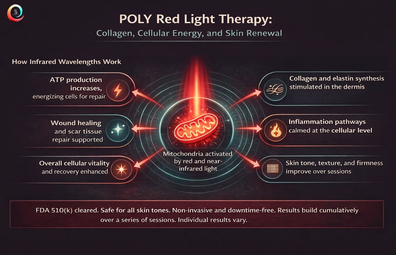 What it is: FDA-cleared, medical-grade LED light therapy using red and near-infrared wavelengths to stimulate cellular activity at the mitochondrial level.