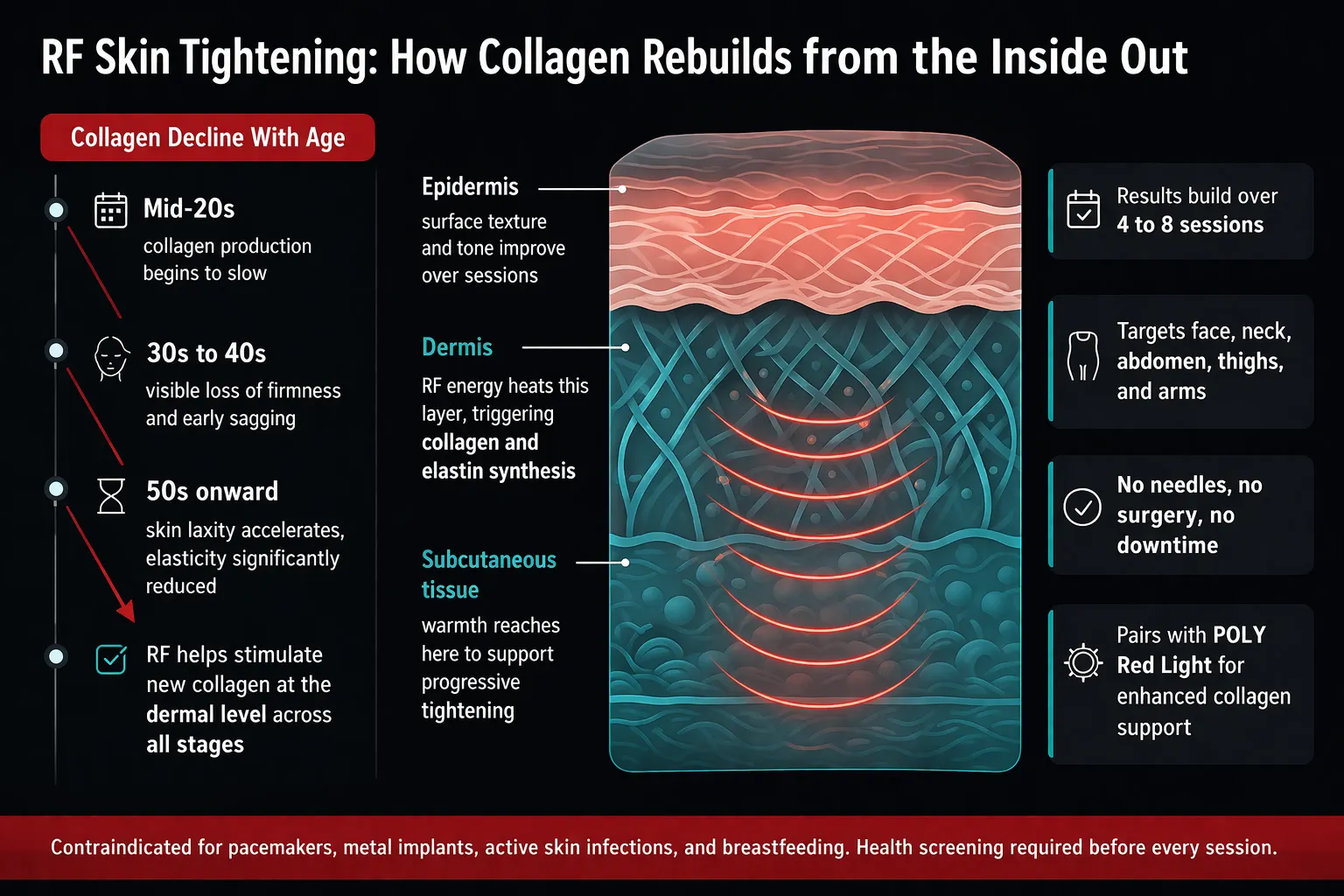 Skin changes, sagging, or dullness | Red light therapy supports collagen stimulation and may help improve skin firmness and tone over consistent sessions. RF targets deeper laxity for progressive tightening |