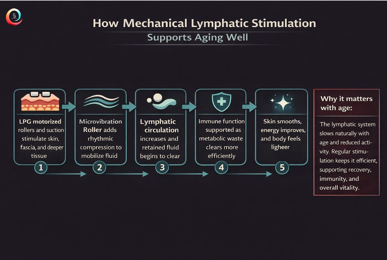 Why it matters: The lymphatic system naturally slows with age, inactivity, and reduced movement. When lymphatic circulation is sluggish, fluid accumulates, toxins clear more slowly, immune function can be compromised, and the body simply feels heavier and more fatigued. Regular mechanical lymphatic stimulation helps keep this system active and efficient. A review by Sahni and Sahni (2024) covering 15 studies found that lymphatic drainage improved swelling, comfort, and recovery in older and post-surgical clients.