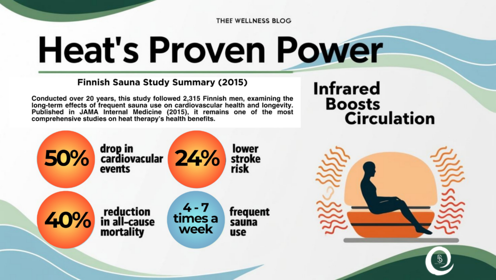 Laukkanen, J. A., Laukkanen, T., Khan, H., Zaccardi, F., Toriola, A. T., & Kunutsor, S. K. (2024). The multifaceted benefits of passive heat therapies for extending the healthspan: A comprehensive review with a focus on Finnish sauna. Temperature, 11(1), 27–51. This comprehensive review integrates data from large Finnish cohort studies involving more than 2,000 middle-aged men followed for over 20 years, along with smaller intervention trials of passive heat therapies. Frequent sauna bathing (four to seven sessions per week) over many years was associated with lower cardiovascular and all-cause mortality, improved autonomic balance, reduced blood pressure, and better cardiorespiratory fitness compared with infrequent sauna use, supporting regular passive heat exposure as a strategy to enhance long-term cardiovascular resilience and healthspan. https://pmc.ncbi.nlm.nih.gov/articles/PMC10989710/