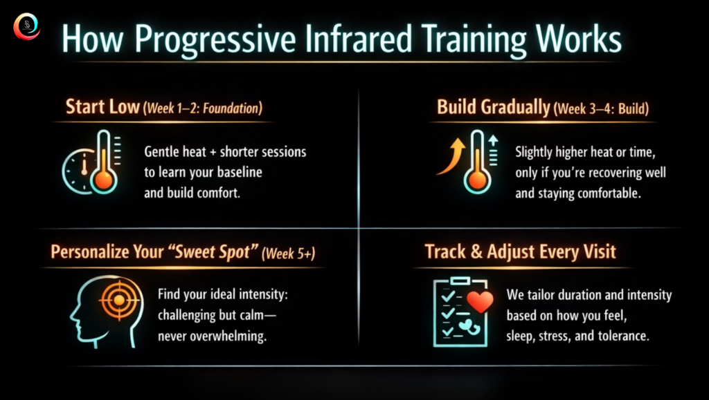 Infrared heat can be safe for individuals with low heat tolerance or sensitivities when introduced gradually and monitored carefully. Unlike high-temperature saunas or intense outdoor activity, infrared training delivers the benefits of heat exposure at milder, more controlled temperatures.