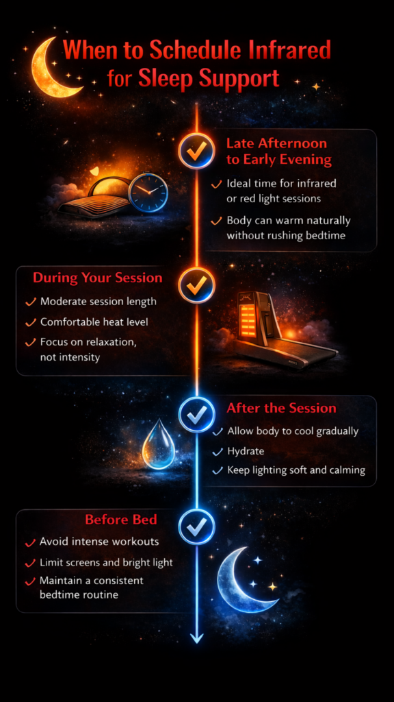 Infrared therapy may help support relaxation by gently warming the body and promoting smoother blood flow. This has been associated with calming the nervous system, reducing the “fight or flight” responses, and shifting the body into a more relaxed state. A calmer nervous system can make falling asleep easier, particularly for those dealing with anxiety or mental tension that disrupts rest.