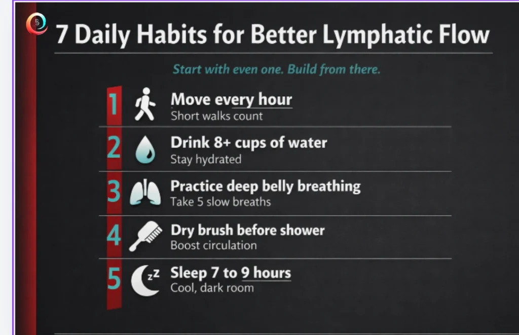 The lymphatic system has no pump of its own it relies entirely on your movement to keep fluid flowing. If you sit at a desk for most of the day, try building in “movement snacks”: