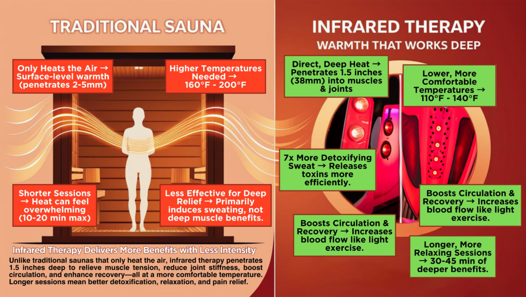 Infrared wavelengths promote deep-tissue warming through advanced thermal conduction. This internal warming supports vasodilation, enhances microcirculation, and increases heart rate in a way that is similar to light to moderate exercise.