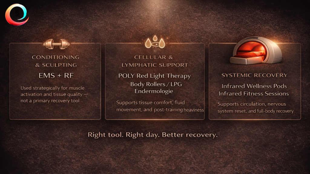 This combination is best positioned as a conditioning and sculpting modality, rather than a primary recovery tool. Because EMS places mechanical demand on muscle tissue, it is typically scheduled away from intense training or recovery-focused sessions, and used strategically to support muscle tone, posture, and physique maintenance during lighter training phases or aesthetic-focused blocks.