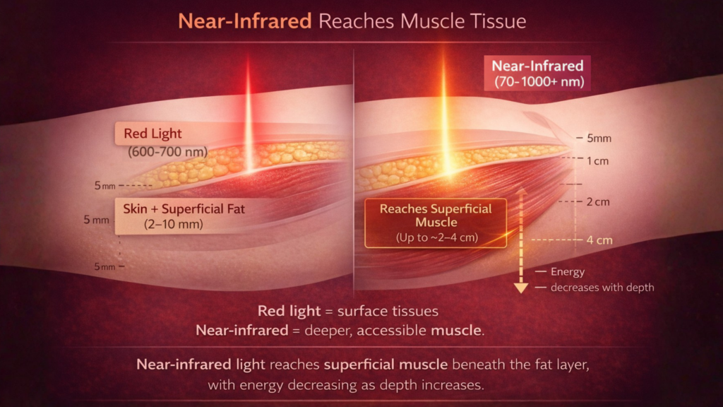 Mechanistic reviews and experimental work also show that near infrared and red wavelengths 600 to 1100 nm can enhance mitochondrial energy production via cytochrome c oxidase and modulate nitric oxide signalling, which contributes to improved cellular function and local blood flow Quirk et al., 2020; Herrera et al., 2024.