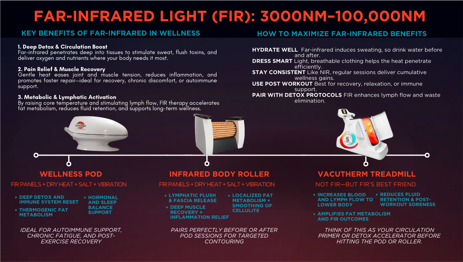 Far Infrared FIR approximately 3 µm–1 mm, operates at the longest wavelengths of the infrared spectrum. Far infrared is typically experienced as radiant heat. It can raise skin and tissue temperature and support circulation responses, sweating, and deep relaxation.