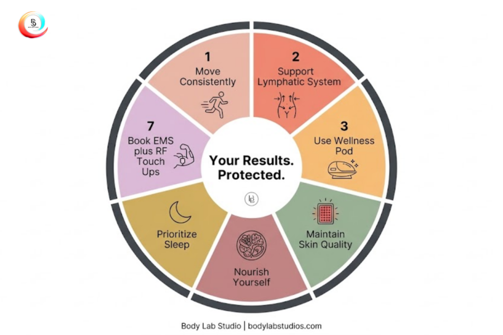 At Body Lab Studio, we know how to help you reach your goals, and we also understand that maintaining those results requires consistent but realistic maintenance. This guide is your no stress, science supported, client tested roadmap to long term success. From our Wellness Pod sessions and LPG Endermologie to POLY red light therapy and EMS plus RF touch ups, everything here is grounded in research and built around approachable lifestyle habits, not harsh restrictions.