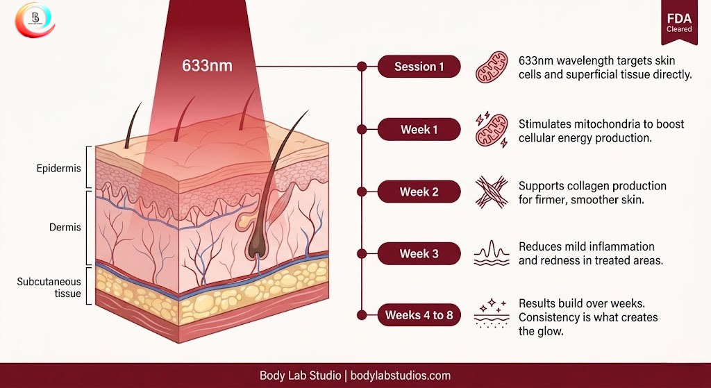These benefits are particularly helpful after body sculpting, when you want the skin over treated areas to look smooth, firm, and healthy. Scientific reviews of red light therapy in dermatology have reported improvements in collagen, healing, and inflammatory skin conditions with repeated sessions over weeks to months.