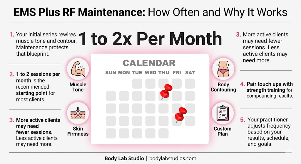 Most clients do not need the same frequency of sessions used in their initial transformation phase. A common starting point for maintenance is one to two EMS plus RF sessions per month, then adjusting over time based on how stable your results feel, how active you are, and what your goals are for the next three, six, or twelve months.