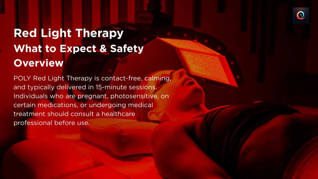 POLY Red Light Therapy is non-invasive, contact-free, and comfortable. Sessions are typically 15 minutes (some protocols may vary by goal). Most people find them calming rather than stimulating.