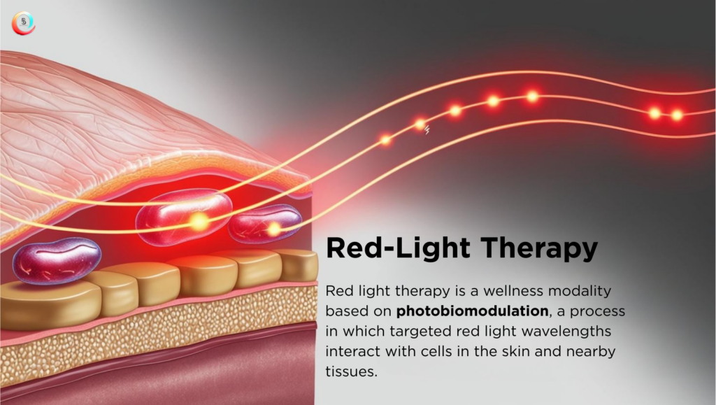 Red light therapy is a wellness modality based on photobiomodulation, a process in which targeted red light wavelengths interact with cells in the skin and underlying tissues to support normal cellular function.