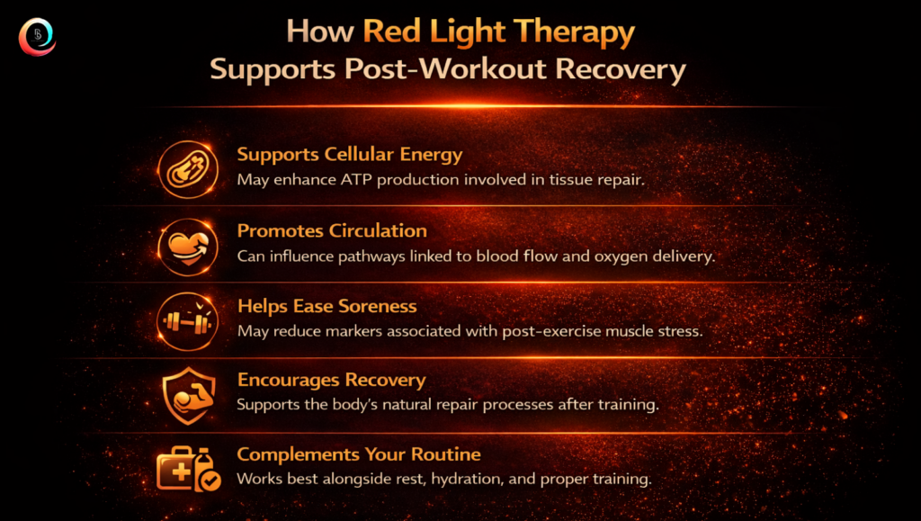 - Supporting mitochondrial activity: Certain molecules within cells absorb red light, which has been associated in studies with increased ATP (cellular energy) production. Because ATP is essential for tissue repair and adaptation, this may contribute to improved post-exercise recovery.