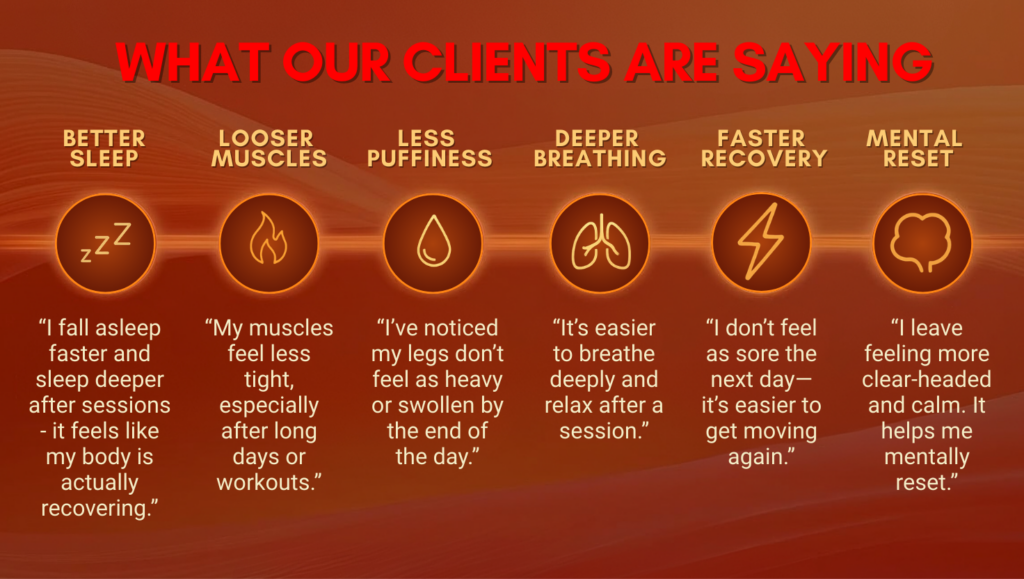 Many clients feel lighter and less puffy after the first session. Visible improvements in skin tone, recovery, and body contour typically appear within 2–6 weeks with consistent sessions.