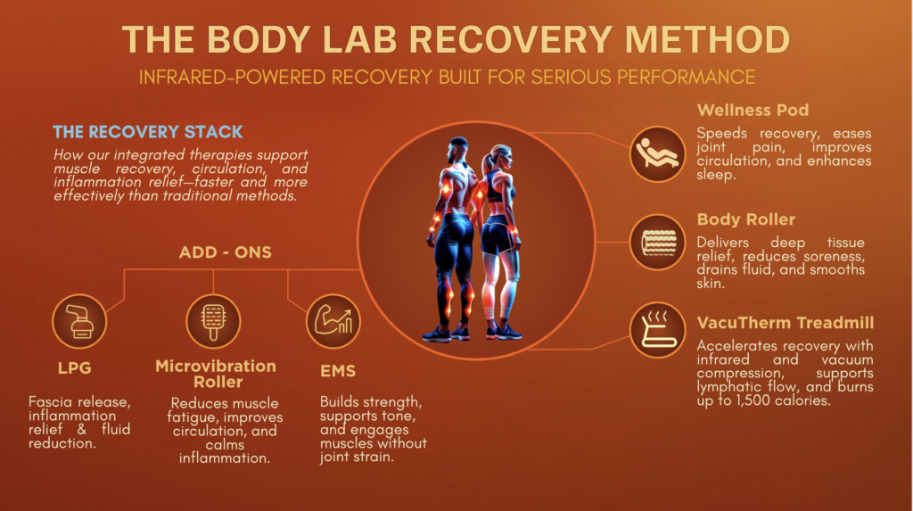 - Wellness Pods & Infrared Fitness: Our Cocoon Fitness Pods and VacuTherm Treadmills combine infrared heat with movement or vibration to boost fat metabolism and circulation.